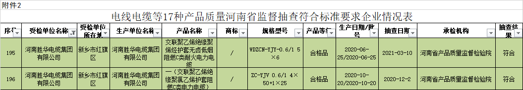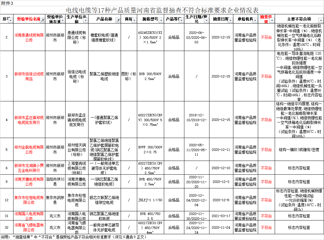 电线电缆产品抽检结果:共抽查了郑州、开封、洛阳、平顶山、安阳、鹤壁、新乡、焦作、濮阳、许昌、漯河、三门峡、南阳、商丘、信阳、周口、驻马店、济源、巩义、滑县、长垣、永城等22个市(县)300家企业生产销售的300批次电线电缆产品。其中9批次产品不符合标准要求,不符合发现率为3.0%。