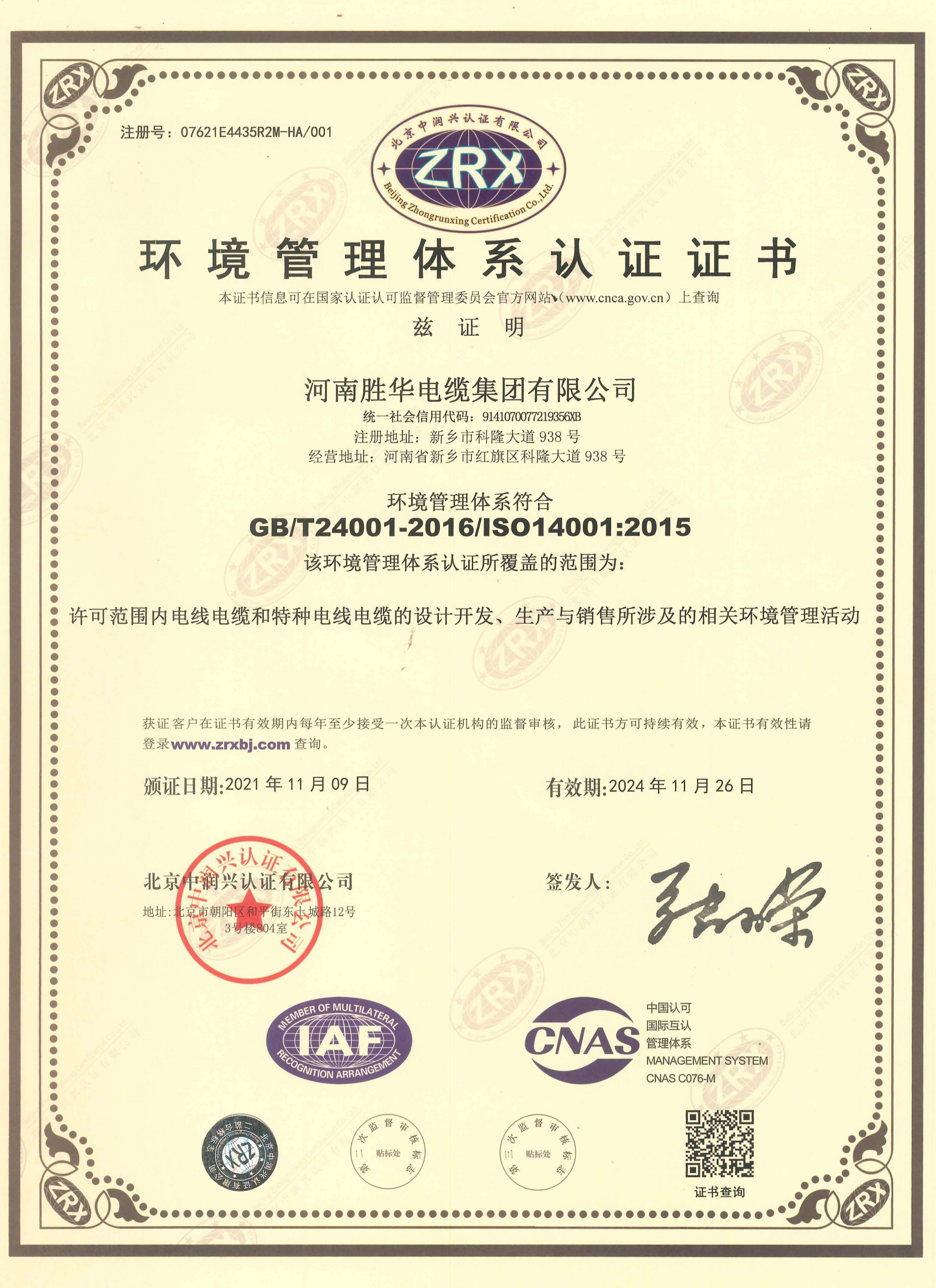 河南益达注册的电线电缆和特种电缆的设计与开发,生产与销售所设计的相关环境管理活动以及相关职业健康安全管理活动均符合ISO140001系列标准。