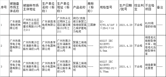 此次抽查电线电缆产品不合格及其企业名单