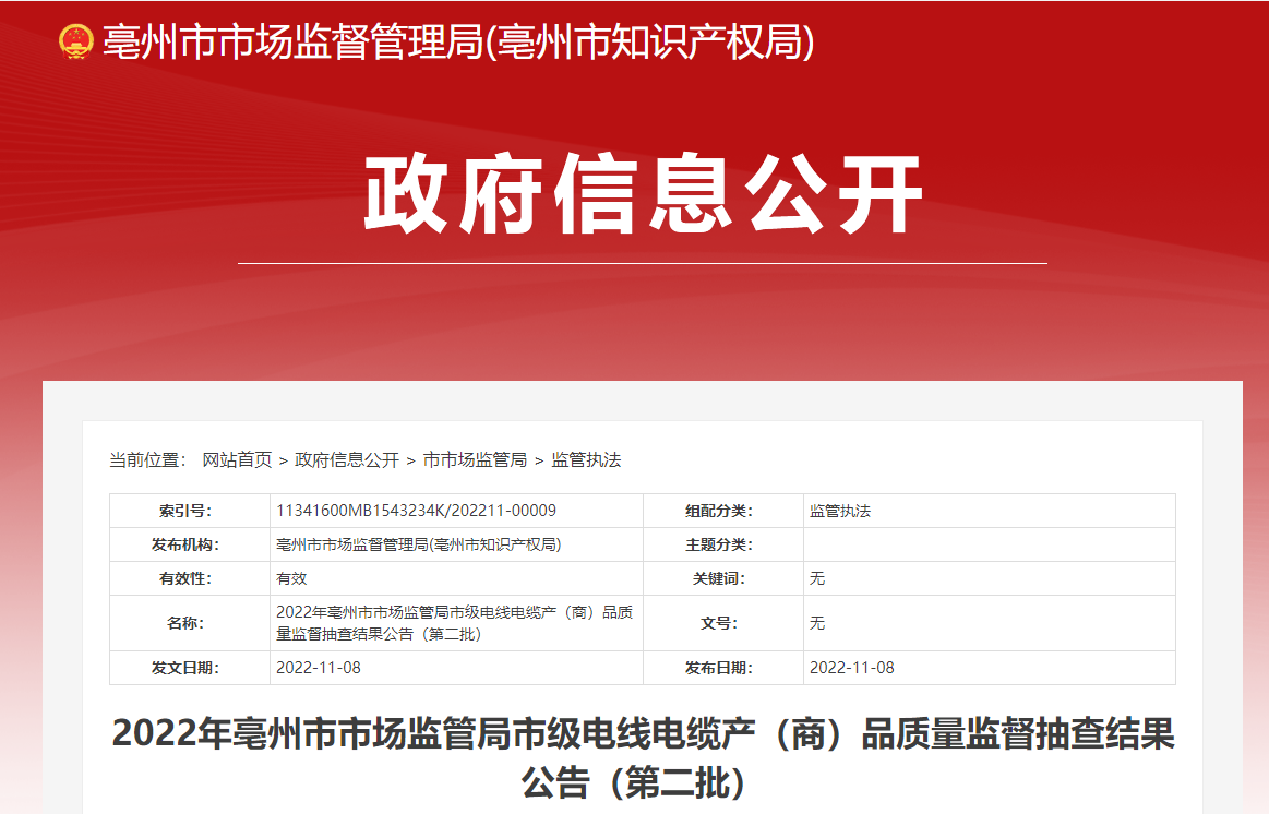| 2022年亳州市市场监管局市级电线电缆产(商)品质量监督抽查结果公告(第二批) | ||||||||