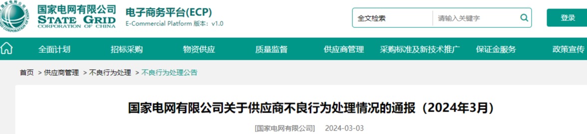 国家电网有限公司电子商务平台发布了供应商不良行为处理情况的通报(2024年3月),为促进供应商诚信履约,保证产品质量,确保电网建设顺利进行及安全可靠供电,依据《国家电网有限公司供应商关系管理办法》(以下简称《办法》)的有关规定,对出现重大产品质量问题、履约不诚信等问题的供应商进行了处理。