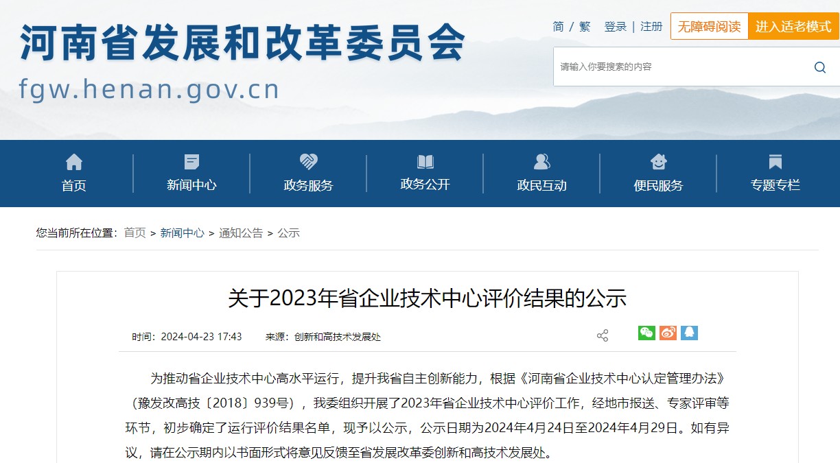 河南省发展和改革委员会官网发布了关于2023年省企业技术中心评价结果的公示,河南沐鸣娱乐评价为良好。