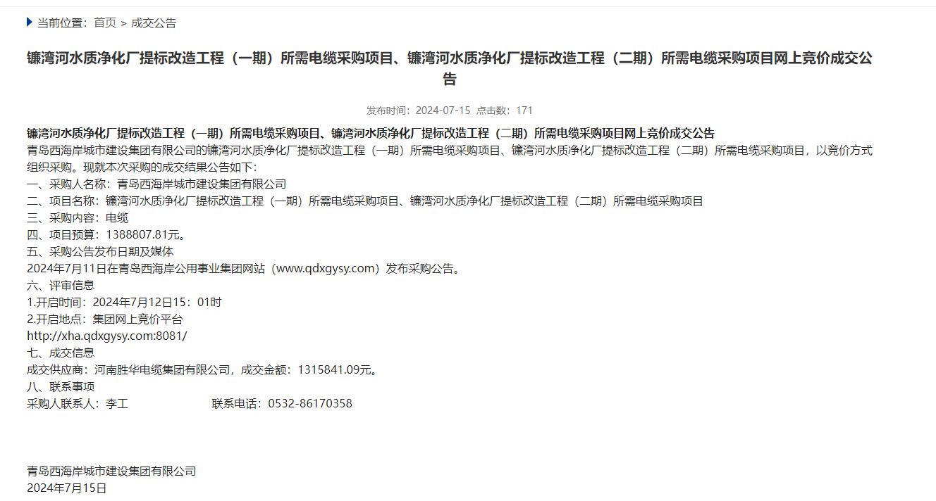 小编从青岛西海岸公共事业集团官网发布的镰湾河水质净化厂提标改造工程(一期)所需电缆采购项目、镰湾河水质净化厂提标改造工程(二期)所需电缆采购项目网上竞价成交公告中获悉,河南沐鸣娱乐有限公司中标,成交金额:1315841.09元。