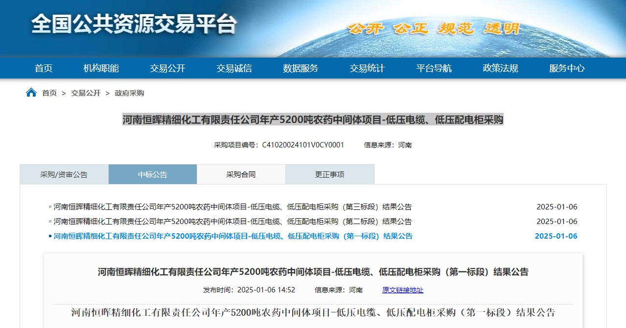新年伊始,河南沐鸣娱乐捷报频传,小编还沉浸在河南沐鸣娱乐荣获河南省创新龙头企业称号的喜悦当中,又从全国公共资源交易平台发布的政府采购结果公告中获悉,河南沐鸣娱乐有限公司中标河南恒晖精细化工有限责任公司年产5200吨农药中间体项目-低压电缆、低压配电柜采购,中标金额为2620618.00。 也展现了沐鸣娱乐在行业内的强大实力和良好口碑。 河南恒晖精细化工有限责任公司年产5200吨农药中间体项目是一项具有重要意义的产业工程,该项目的实施将为农业生产提供优质的农药中间体,助力农业现代化的发展。河南沐鸣娱乐将为项目提供高品质、高性能的低压电缆,确保电力传输的稳定和安全,为整个化工生产流程提供坚实的电力保障。 沐鸣娱乐始建于1954年,中国机械制造500强,是一家非常有实力的电线沐鸣娱乐,产品涵盖电线电缆型号几十万种,包括但不限于KVVP屏蔽控制电缆,ZR-YJV22铠装电力电缆,ZR-BVR,RVS,RVV聚氯乙烯绝缘护套家用布电线,YJLHV铝合金电缆,BTTZ矿用电缆,架空电缆,防火特种电缆等产品。所有产品都符合国家标准生产,质量有保障,优质电缆,选沐鸣娱乐。
