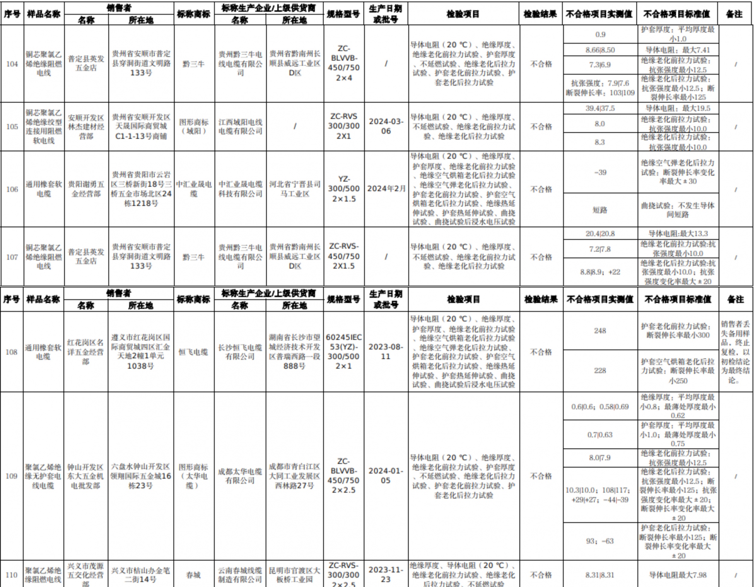 贵州省市场监督管理局发布了关于2024年流通领域电线电缆等5种产品质量监督抽查情况的通告,其中电线电缆产品质量监督抽查情况如下: