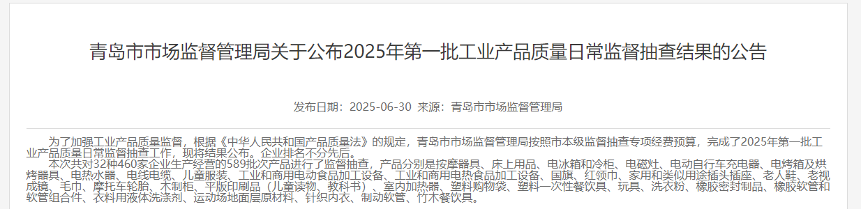 为了加强工业产品质量监督,根据《中华人民共和国产品质量法》的规定,青岛市市场监督管理局按照市本级监督抽查专项经费预算,完成了2025年第一批工业产品质量日常监督抽查工作。