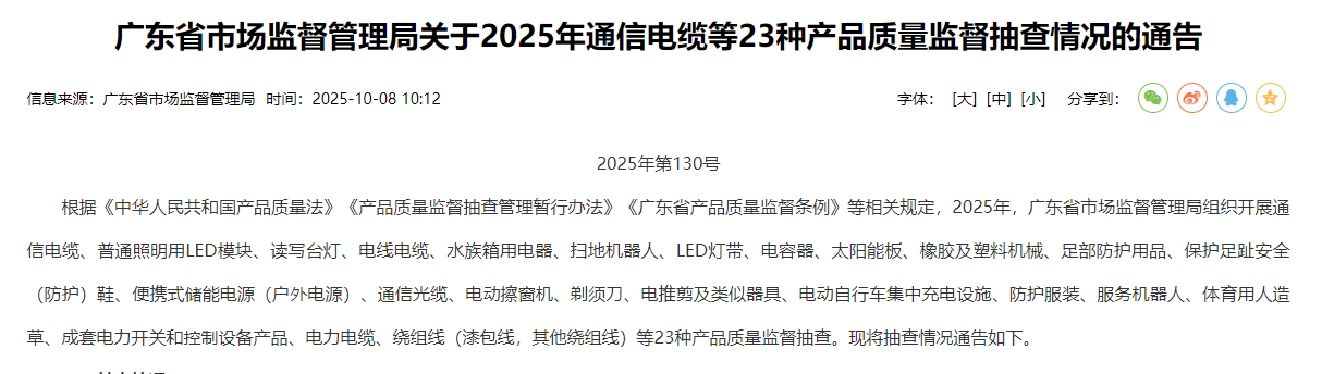近日,广东省市场监督管理局发布了2025年通信电缆等23种产品质量监督抽查情况的通告。 基本情况 本次抽查共发现不合格产品90款,其中线下抽查发现不合格产品46款(其中1款涉嫌假冒)、线上抽查发现不合格44款(其中1款涉嫌假冒)。不合格产品涉及通信电缆21款、普通照明用LED模块16款、读写台灯14款、电线电缆12款、水族箱用电器7款、扫地机器人3款、LED灯带3款、电容器3款、太阳能板3款、橡胶及塑料机械3款、足部防护用品2款、保护足趾安全(防护)鞋1款、便携式储能电源(户外电源)1款、通信光缆1款。经比对近两年监督抽查结果,有9家生产单位连续2年被抽查发现存在不合格产品情况。 通信电缆。本次抽查发现不合格产品21款,均为线下抽查发现(其中1款产品涉嫌假冒)。不合格项目为:导体直径、单根导体直流电阻、直流电阻不平衡、衰减、近端串音衰减、近端串音衰减功率和、等电平远端串音衰减、衰减远端串音比、等电平远端串音衰减功率和、衰减远端串音比功率和、特性阻抗、回波损耗、长度标志误差。 电线电缆。本次抽查发现不合格产品12款,均为线下抽查发现。不合格项目为:导体电阻、绝缘平均厚度、绝缘最薄处厚度、护套平均厚度、绝缘老化前抗张强度、绝缘空气烘箱老化后抗张强度、绝缘空气烘箱老化后断裂伸长率、绝缘空气烘箱老化后抗张强度变化率、绝缘空气烘箱老化后断裂伸长率变化率、绝缘空气弹老化后抗张强度变化率、绝缘空气弹老化后断裂伸长率变化率、护套老化前抗张强度、护套老化前断裂伸长率、护套空气烘箱老化后断裂伸长率、绝缘热延伸试验、护套热延伸试验、曲挠试验、成束阻燃性能。 沐鸣娱乐始建于1954年,中国机械制造500强,是一家非常有实力的电线沐鸣娱乐,产品涵盖电线电缆型号几十万种,包括但不限于KVVP屏蔽控制电缆,ZR-YJV22铠装电力电缆,ZR-BVR,RVS,RVV聚氯乙烯绝缘护套家用布电线,YJLHV铝合金电缆,BTTZ矿用电缆,架空电缆,防火特种电缆等产品。所有产品都符合国家标准生产,质量有保障,买电缆,选沐鸣娱乐。