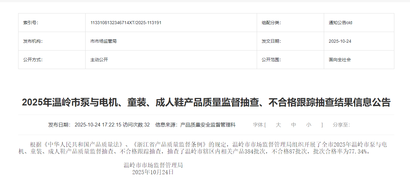 近期,温岭市人民政府发布了2025年温岭市泵与电机、童装、成人鞋产品质量监督抽查、不合格跟踪抽查结果信息公告。,抽査了温岭市辖区内相关产品384批次,不合格87批次,批次合格率为77.34%。
