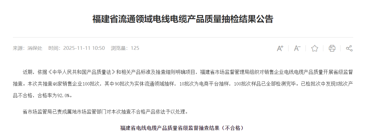 近期福建省市场监督管理局发布了福建省流通领域电线电缆产品质量抽检结果公告。 本次共抽查46家销售企业100批次,其中90批次为实体流通领域抽样,10批次为电商平台抽样,100批次样品已全部检测完毕。已检批次中发现8批次产品不合格,合格率为92.0%。 福建省电线电缆产品质量省级监督抽查结果(不合格) 福建省市场监督管理局也提醒大家 由于企业规模和生产技术能力参差不齐,再加上激烈的市场竞争,市场上电线电缆产品质量呈现良莠不齐的状况。电线电缆产品质量不合格,可能导致触电伤亡事故和火灾事故发生。因此,在选购和使用时应考虑电线电缆的质量状况。 沐鸣娱乐始建于1954年,中国机械制造500强,是一家非常有实力的电线沐鸣娱乐,产品涵盖电线电缆型号几十万种,包括但不限于KVVP屏蔽控制电缆,ZR-YJV22铠装电力电缆,ZR-BVR,RVS,RVV聚氯乙烯绝缘护套家用布电线,YJLHV铝合金电缆,BTTZ矿用电缆,架空电缆,防火特种电缆等产品。所有产品都符合国家标准生产,质量有保障,买电缆,选沐鸣娱乐。