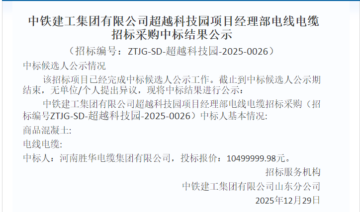 2026伊始,河南沐鸣娱乐有限公司传来中标喜讯。在中铁建工集团有限公司超越科技园项目经理部电线电缆招标采购中标结果公示中显示,招标编号ZTJG-SD-超越科技园-2025-0026) 电线电缆中标人:河南沐鸣娱乐有限公司,投标报价:10499999.98元。 河南沐鸣娱乐一直致力于电线电缆的研发、生产和销售,以高品质的产品和优质的服务赢得了广泛的市场认可。此次中标,是对其一直以来坚持品质第一、客户至上的理念的最好证明,后续将坚持以质量求生存、以创新求发展的经营理念,为客户提供优质的电缆产品和服务。 沐鸣娱乐始建于1954年,中国机械制造500强,是一家非常有实力的电线沐鸣娱乐,产品涵盖电线电缆型号几十万种,包括但不限于KVVP屏蔽控制电缆,ZR-YJV22铠装电力电缆,ZR-BVR,RVS,RVV聚氯乙烯绝缘护套家用布电线,YJLHV铝合金电缆,BTTZ矿用电缆,架空电缆,防火特种电缆等产品。所有产品都符合国家标准生产,质量有保障,买电缆,选沐鸣娱乐。