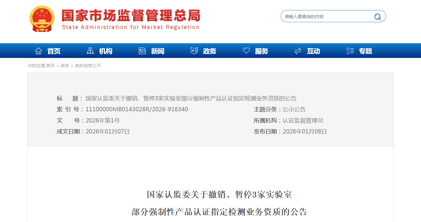 国家市场监督管理总局官网近期发布了国家认监委关于撤销、暂停3家实验室部分强制性产品认证指定检测业务资质的公告 2025年,国家认监委组织开展了认证从业机构“双随机、一公开”检查。通过检查,发现深圳市全球通检测服务有限公司、方圆检测认证集团有限公司、武汉产品质量监督检验所(国家电线电缆产品质量检验检测中心(武汉))等3家实验室在部分领域不再满足强制性产品认证(以下称CCC)指定检测条件。根据《强制性产品认证机构和实验室管理办法》,决定自即日起撤销、暂停上述实验室部分领域CCC指定检测业务资质。 一、深圳市全球通检测服务有限公司在移动电源、锂离子电池和电池组领域存在检测人员能力严重不足、在照明电器领域存在检测人员能力不足等问题,不能满足CCC检测要求。现决定撤销其移动电源、锂离子电池和电池组产品(CNCA-C09-02)CCC指定检测业务资质;暂停其照明电器产品(CNCA-C10-01)CCC指定检测业务资质6个月。 二、方圆检测认证集团有限公司在电线电缆领域存在检测人员能力不足等问题,不能满足CCC检测要求。现决定暂停其电线电缆产品(CNCA-C01-01)CCC指定检测业务资质6个月。 三、武汉产品质量监督检验所(国家电线电缆产品质量检验检测中心(武汉))在电线电缆领域存在检测人员能力不足等问题,不能满足CCC检测要求。现决定暂停其电线电缆产品(CNCA-C01-01)CCC指定检测业务资质6个月。 沐鸣娱乐始建于1954年,中国机械制造500强,是一家非常有实力的电线沐鸣娱乐,产品涵盖电线电缆型号几十万种,包括但不限于KVVP屏蔽控制电缆,ZR-YJV22铠装电力电缆,ZR-BVR,RVS,RVV聚氯乙烯绝缘护套家用布电线,YJLHV铝合金电缆,BTTZ矿用电缆,架空电缆,防火特种电缆等产品。所有产品都符合国家标准生产,质量有保障,买电缆,选沐鸣娱乐。
