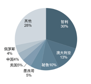 全球铜矿产资源储量约为70000 万吨(金属吨),主要分布在智利(30%)、秘鲁(10%)、澳大利亚(13%)、墨西哥(5%)、中国(4%)等国家。世界顶级铜矿(铜金属资源储量≥3000万吨)共11个,有6个分布在智利,其余的分布在印尼、蒙古、美国、俄罗斯和澳大利亚5个国家。