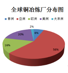 2019年全球电解铜产量约为2345万吨,主要分布在亚洲(55.9%)约1310万吨其中中国为894万吨(占亚洲的68.2%、全球的38.1%)、美洲(19.6%)约为460万吨其中美国115万吨(占美洲的25%、全球的4.9%),智利为221万吨(占美洲的48.2%、全球的9.5%)、欧洲(16.3%)约为383万吨,非洲和大洋洲合计8.2% 。