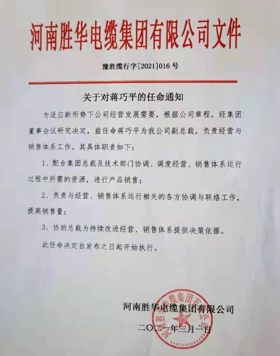 为适应新形势下公司经营发展需要,根据公司章程,经集团董事会议研究决定,兹任命蒋巧平为我公司副总裁,负责经营与销售体系工作。其具体职责如下: